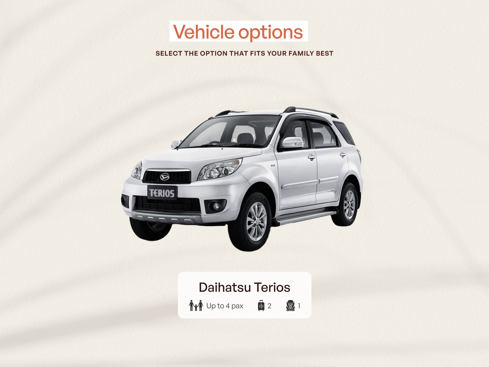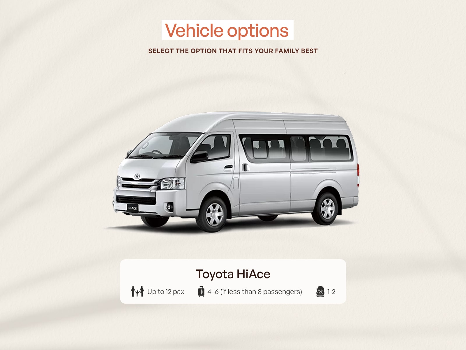 Booking is easy and takes less than a minute. Select your preferred vehicle and tap the button to start a WhatsApp chat with us.