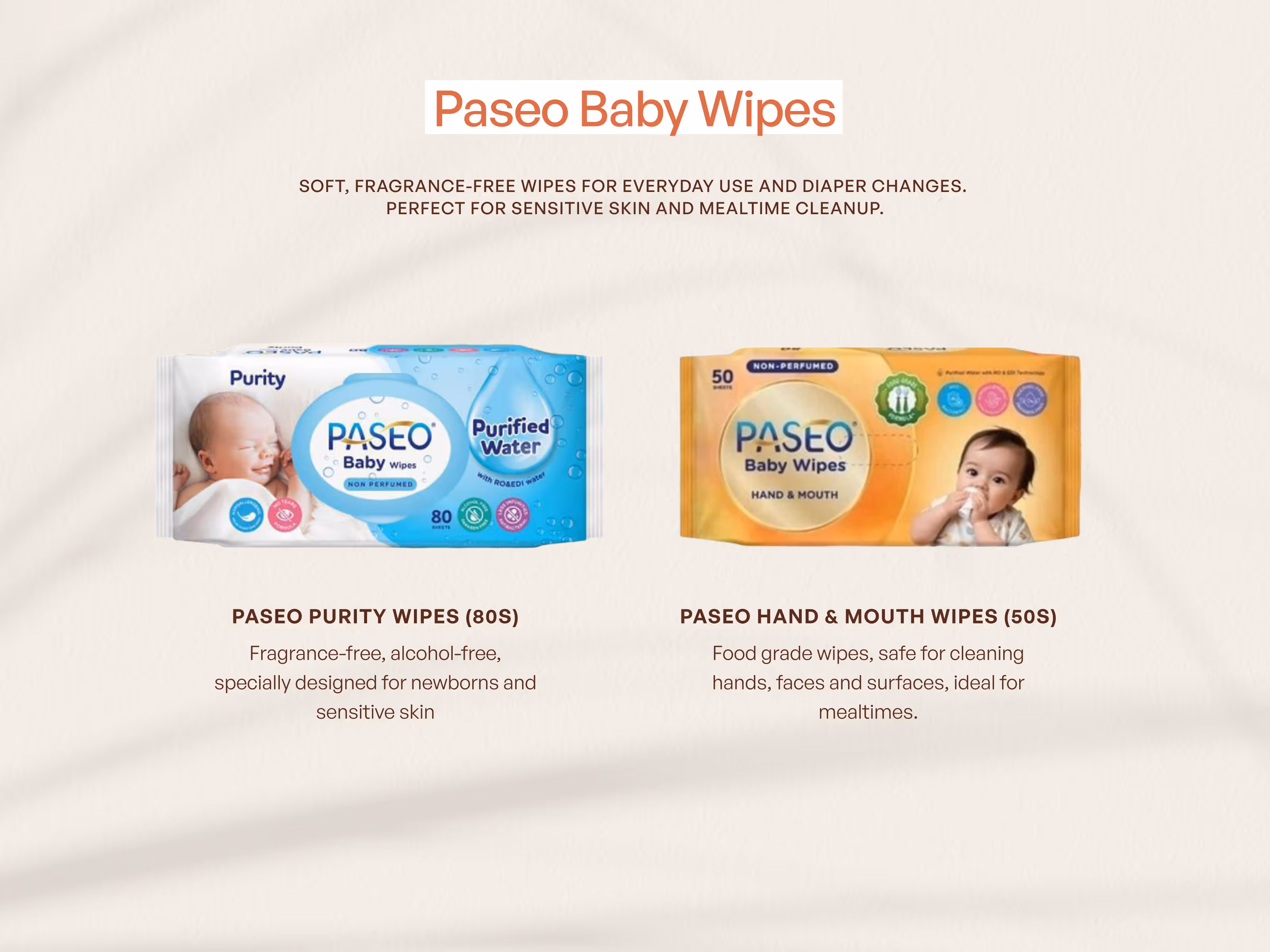 Unscented, suitable from birth, and specially made for sensitive skin. Perfect for everyday cleanups, diaper changes, and travel use. - Paseo Hand & Mouth Wipes (50 sheets):